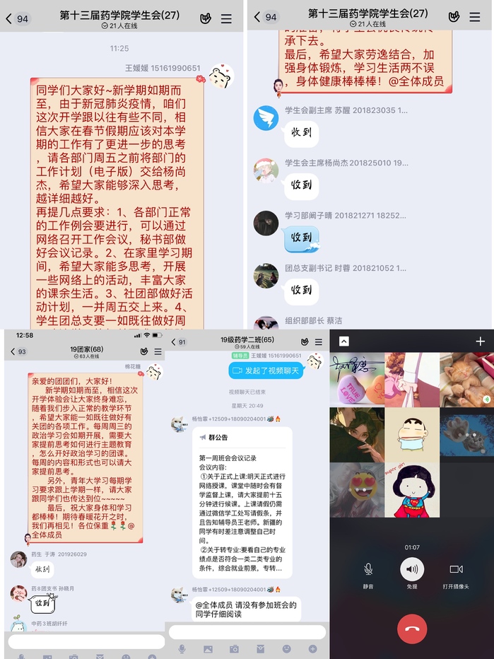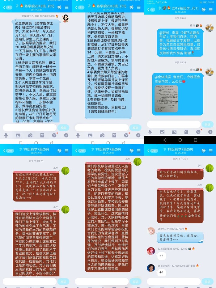 2月15-16日,全体专兼职辅导员老师通过qq群、微信群等组织各班级召开了新学期主题班会,向同学们传达了关于新学期的具体要求,并希望大家做好居家自我防护,积极配合老师线上教学,做到劳逸结合,相信在全体师生的共同努力下一定能打赢这场疫情防控阻击战!(药学院王媛媛供稿)