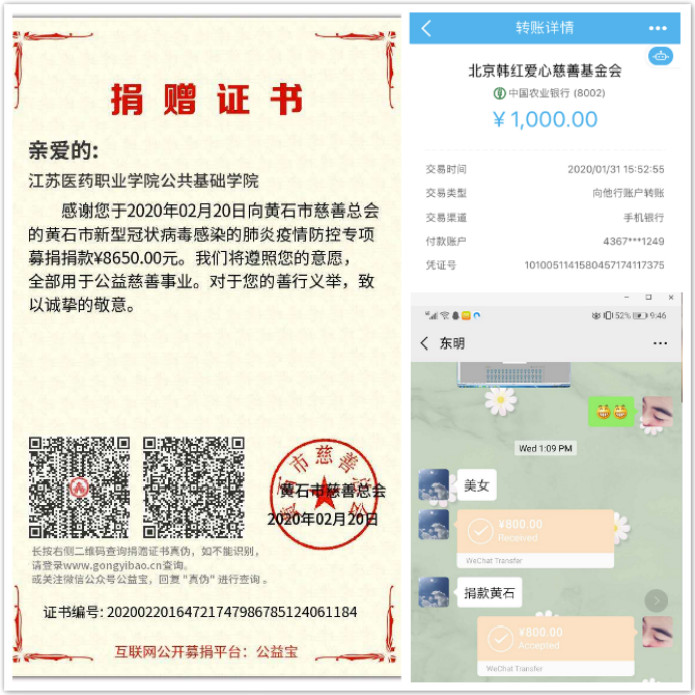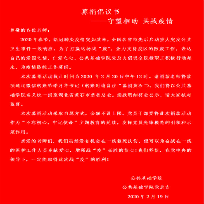 2月19日,公共基础学院党总支在全院发起“守望相助 共战疫情”募捐倡议,为疫情防控工作开展自愿募捐。老师们积极响应,募集善款8650元,捐赠至湖北省黄石市慈善总会,全力支持疫区的防疫工作。除选择院内募捐外,部分教师也积极通过其他途径捐资捐物。