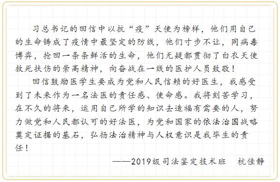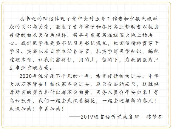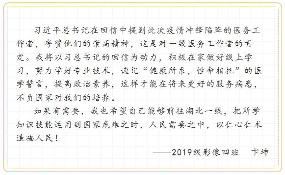 一个时代有一个时代的召唤,一代人有一代人的使命。在举国上下众志成城、齐心协力抗击新冠肺炎疫情的关键时期,习近平总书记给西藏大学医学院学生的回信对青年医学生的谆谆嘱托、殷殷期望在苏医学子中引起强烈反响。习总书记的回信发人深省,这封回信不仅仅是对17名西藏医学生的肯定和鼓励,更是对全国医学生的鼓舞和要求,回信中不仅体现了广大医务工作者在新冠疫情防控中不惧危险、救死扶伤的崇高精神,更体现出医护工作者的使命与担当,同时更加坚定了全国医学生学医的初心,行医的使命!