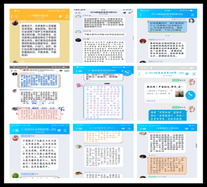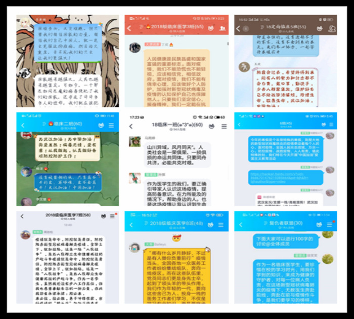 值此特殊时刻,为传递正能量,加强爱国主义教育,培养德才兼备的新时代医学生,医学院在本周三的政治学习中开展了“中国加油”的爱国主义线上教育活动。活动过程中,各班级通过QQ群观看了“中国加油”的微视频,并以“疫情下,作为一名青年学生,就抗击疫情、学习专业知识、增强爱国情”为主题展开了讨论。