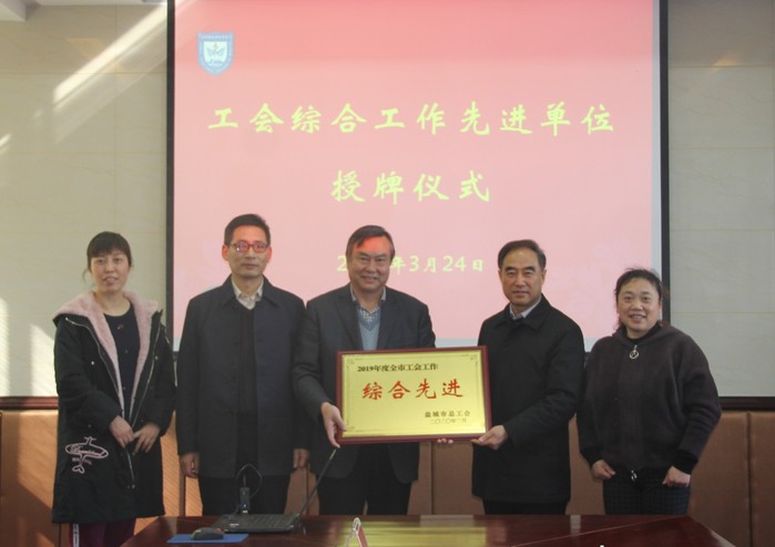 盐城市总工会为我校荣获“2019年度盐城市工会综合工作先进单位”授牌