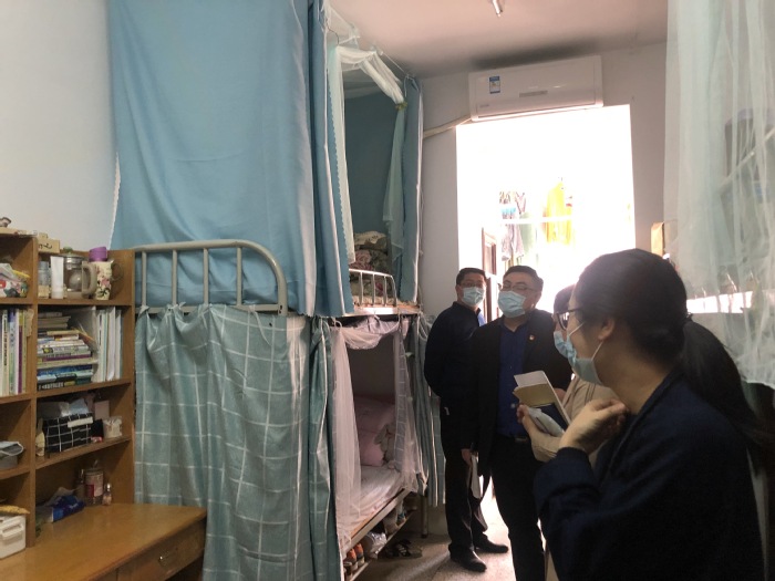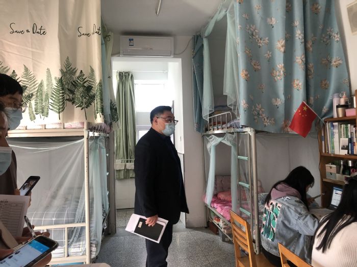 4月29日下午,医学院党总支书记周文超带领部分专兼职辅导员前往学生宿舍,为各班级推荐的优秀宿舍评选打分。周书记对整洁温馨的宿舍环境表达了赞许,并强调在校隔离期间,一定要注重个人卫生,保持宿舍环境干净整洁,做到勤洗手、戴口罩,勤通风,打造健康舒适的宿舍环境。