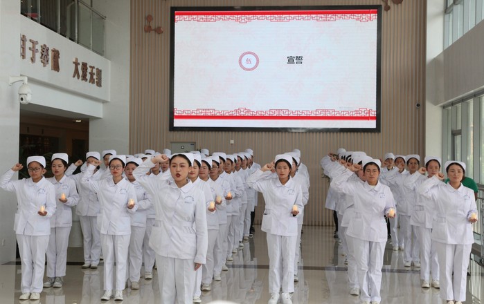 授帽仪式上,盐城援鄂医疗队的11位队员为55名2019级护理学子依次佩戴象征白衣天使崇高使命的燕尾帽。一盏红烛守护生命之光,铿锵誓言道出医者担当。盐城市一院驰援武汉医疗队队长、重症监护室护士长颜春燕讲述了在武汉奋战整整71天的经历,讲到动情之处,现场师生眼含热泪,并报以热烈的掌声。一百多年前“提灯女神”南丁格尔用爱与责任树起的精神丰碑,吸引了无数后继者将青春和热血注入了护理工作这样一个伟大的事业。今天,这样一群优秀的抗疫代表用他们的实际行动,谱写一曲曲动人的生命之歌。