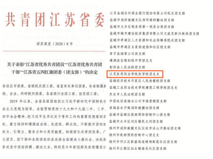 近日,根据共青团江苏省委《关于表彰“江苏省优秀共青团员”“江苏省优秀共青团干部”“江苏省五四红旗团委(团支部)”的决定》(团苏委发﹝2020﹞8号)文件精神,我校医学院团总支荣获“江苏省五四红旗团总支”称号。“江苏省五四红旗团支部(总支)”是共青团江苏省委授予基层团组织的最高荣誉,也是我院团总支首次获得该项殊荣。