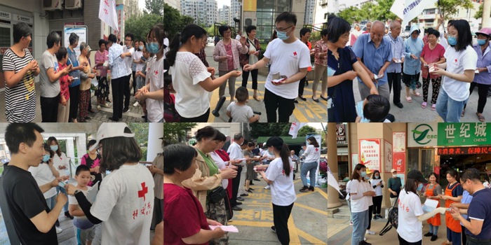 烈日炎炎,温情不断。志愿者们冒着酷暑,奔赴各地,围绕新冠疫情个人防护、心肺复苏应急救护指导和心理健康教育为主题内容,对商业聚集区和农贸市场的商贩以及来往市民开展血压测量、七步洗手法、心肺复苏术指导、个人卫生防护和夏季健康养生知识宣传等服务活动。同时,为了提高居民们的参与度,志愿者不仅和他们做快乐七步洗手操的互动,还为居民们发放口罩、风油精和洗手皂等个人卫生防护小礼品。活动前后,同学们有序进出市场,成为了一道亮丽的风景线,收到了广大居民们的一致好评。