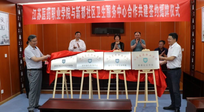 最后,副院长侍杏华与盐南高新区党工委副主任潘迎华共同为“社区康复服务中心”“康复生产性实训基地”“康复医学院大学生社会实践基地”“新都社区学院”揭牌。