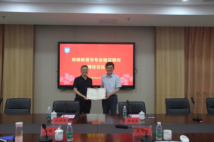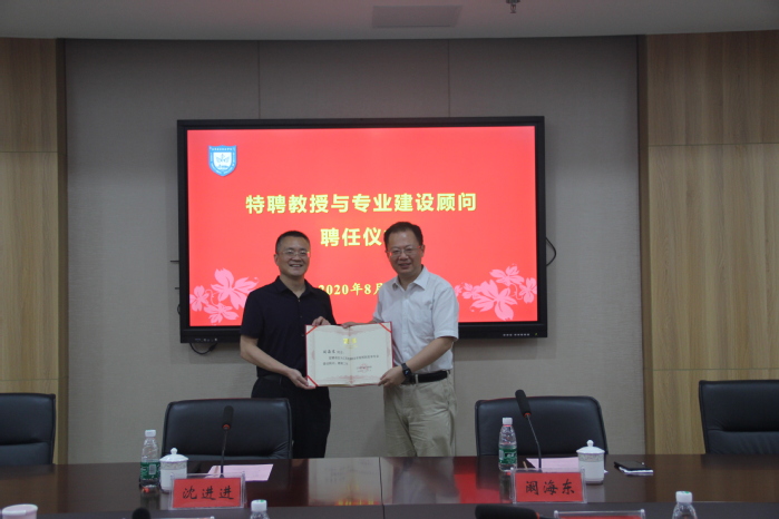 会上,学校副院长高璀乡介绍了学校近年来在专业建设、人才培养、教学科研等方面取得的成绩和发展规划。医学技术学院负责人介绍了两位专家的基本情况。随后,院长陈国忠代表学校为沈进进教授颁发预防医学专业特聘教授聘书,为阚海东教授颁发预防医学专业建设顾问聘书,并对他们一直以来关心和支持我校工作表示感谢。
