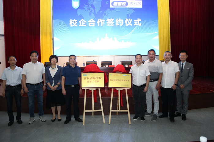 随后,双方代表签订校企合作协议书,院长陈国忠、副院长高璀乡分别为 “校企共建药学实训基地”和“社区药师学院储备干部班”揭牌。