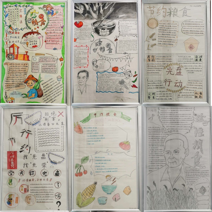 在团课学习结束后,同学们化感悟为行动,拿起画笔绘就心中誓言,积极参加学院举办的手抄报比赛。2019级口腔医学技术专业用丰富的色彩和卡通的笔触来告诉大家要节约粮食、杜绝浪费;2019级卫生信息管理和2019级医学检验技术3班的同学则采用简洁的布局和凝练的色彩传达珍惜粮食的想法;2019级预防医学4班、2019级医学检验4班和2019级预防医学1班的同学则采用铅笔画的形式提醒大家要厉行节约。