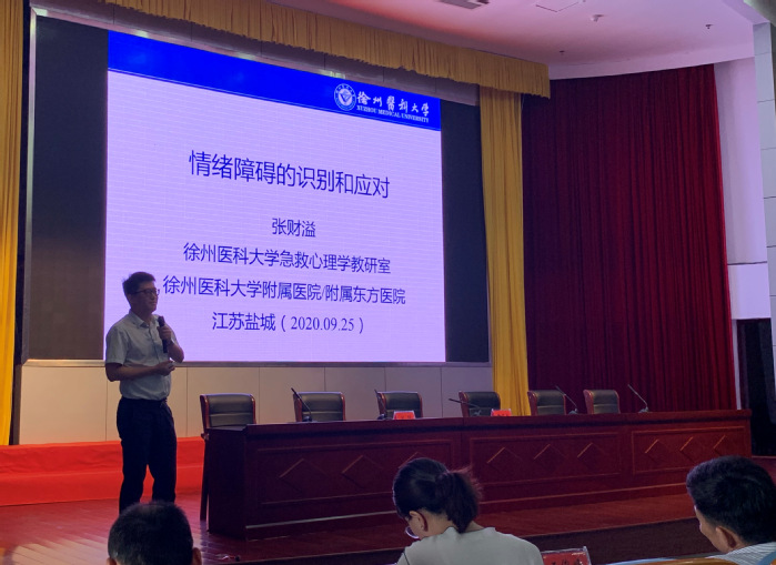 9月25日下午,我校在国际会议交流中心举办主题为“情绪障碍的识别和应对”的心理健康专题讲座。本次讲座特邀徐州医科大学附属医院张财溢副主任为我校师生进行专业讲解,学工处、团委全体人员,各二级学院党总支书记、副书记,全体专兼职辅导员、心理课教师,各班级心理委员、宿舍长参加了培训。讲座由学工处副处长刘辉主持。