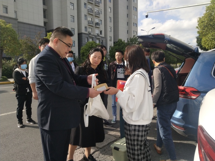 10月8日上午8点,医学院党政班子和志愿者们早已在门口等候,期待着第一位新同学的到来。8点半,2020级临床医学6班沈心茹到达解放校区南门。医学院党总支书记周文超将学院信封递给她,并悉心叮嘱注意事项。医学院院长吴芹对她的到来表示了热烈的欢迎,与其亲切交谈,让她感受到了家的温暖。