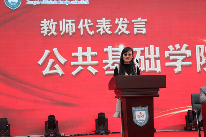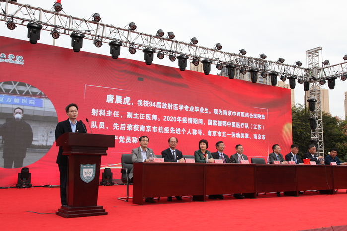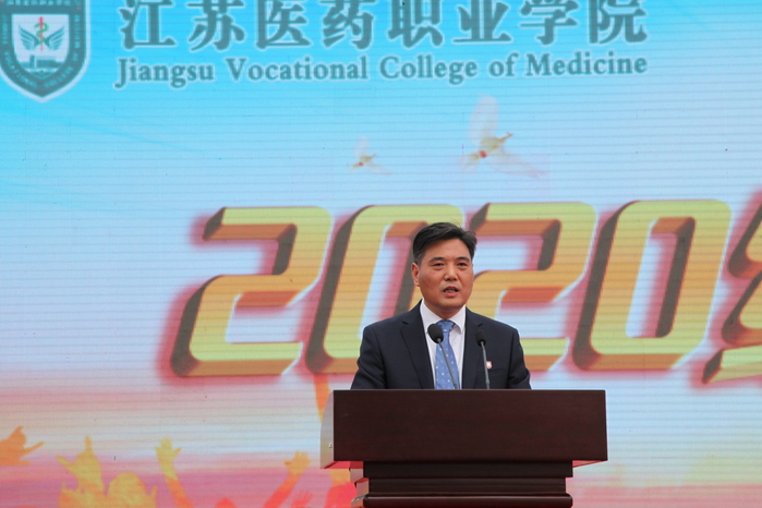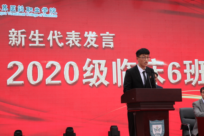 2020级临床6班滕子恒、2019级药学5班房颖分别代表新、老生学生代表发言。滕子恒号召新生努力成长为“胸有大志、心有大我、肩有大任、行有大德”的新一代青年;房颖分享了在苏医的学习经历,表示将以饱满的状态和昂扬的斗志接受更高要求的考验,努力成为国家需要的医药创新人才。公共基础学院李正亚老师作为教师代表,勉励新生在大学期间树立明确的目标,做好学习规划,争做内心强大、有坚强毅力的人。我校94届放射医学专业毕业生、南京中西医结合医院放射科主任、国家援鄂中医医疗队(江苏)队员唐晨虎,作为校友代表分享了在2020年疫情期间,他支援武汉的心路历程以及在援鄂期间的感人事迹。