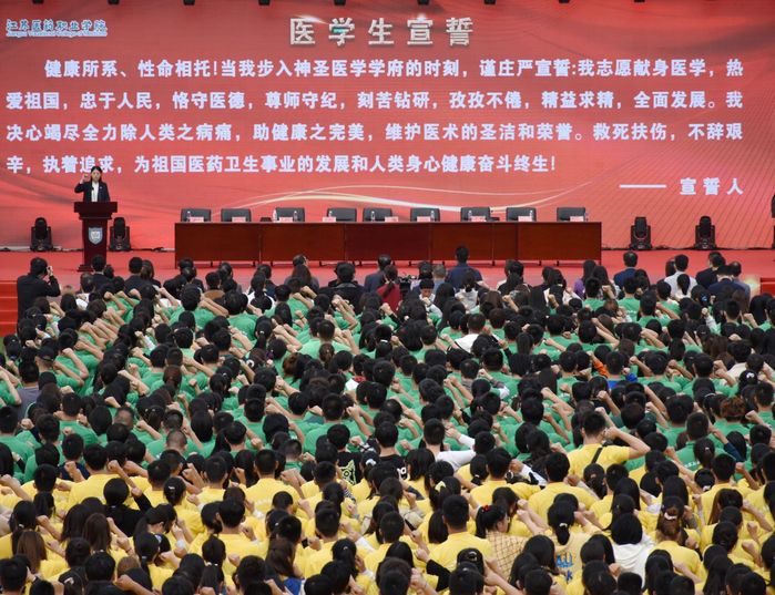 医学技术学院院长俞敏带领2020级全体新生进行了庄严的医学生誓言宣誓。大家高握右拳,郑重承诺,慷慨洪亮的声音在宣告他们有信心和决心做一名优秀的医学生,为祖国医药卫生事业的发展和人类身心健康奋斗终生。