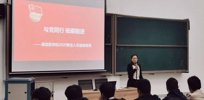 康复医学院党总支组织员蒋广平老师则从“当代大学生为什么要入党”“入党的程序和要求”“怎样写入党申请书和自传”等三方面为全体新生进行详细讲解,并现场解答了同学们关于入党过程中的疑问。她还向广大新生介绍了疫情期间我校毕业的优秀共产党员们逆向而行、白衣执甲的先进事迹,鼓励新生们认真学习优秀党员的高尚品质,领悟共产党人的初心与使命,端正入党动机,坚定信仰、乐于奉献、积极行动,争取早日入党。