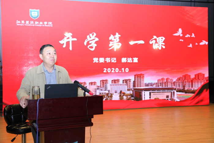 院长陈国忠为医学院全体新生讲授题为《践行苏医精神 做与时代同行的苏医人》的开学思政第一课。陈院长从学校的办学历史出发,阐述了江苏医药职业学院的发展历史是一部创业史,也是一部与祖国共奋进,与时代同发展的奋斗史。学校作为省市三方共建高校、江苏省示范性高职院校,注重传承铁军精神、好人精神,培养学生的医学人文情怀和工匠精神,孕育了一大批爱国情怀深厚、理论知识丰富、操作技能娴熟的健康中国事业的建设者与接班人。