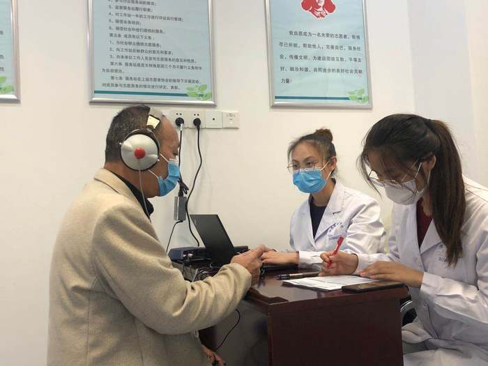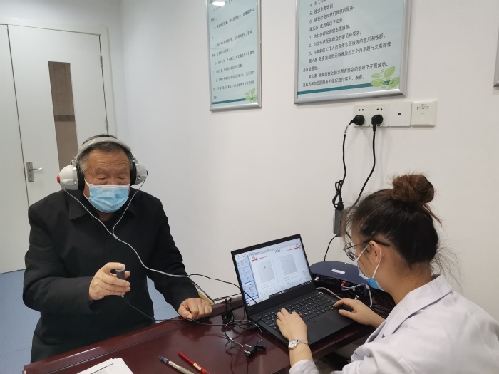 吕老师在为老人做纯音测听