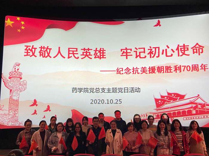 为纪念中国人民志愿军抗美援朝出国作战70周年,进一步激发爱国热情,弘扬爱国主义光荣传统,10月26日下午,药学院党总支组织学院全体党员教师、入党积极分子、学生干部等80余人集体观看抗美援朝题材电影《金刚川》,开展“致敬人民英雄,牢记初心使命”主题党日活动。