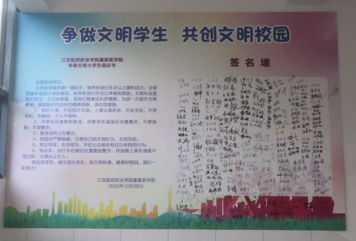 文明使者,共创和谐。为进一步提升文明素养,展现大学生良好的精神面貌,康复医学院发出了《争做文明学生,共创文明校园倡议书》,倡议同学们从点滴做起、从身边做起,创优良学风、做文明大学生,创文明环境、建美好校园。此外,在每个班级的公告栏上,康复医学院制作了崭新的文明修身小提示,以“浸润式”宣传对同学进行提醒和要求,润物无声地提升学生的文明意识。