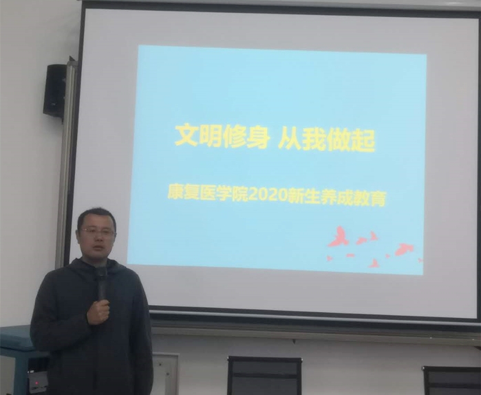 文明修身,从我做起。10月28日晚,康复医学院辅导员蒋广平老师面向2020级新生作题为《文明修身,从我做起》的专题讲座,重点围绕“学会问好”“从小事做起”“牢记警戒线和高压线”等三方面具体展开,引导大学生自我管理、自我教育、自我服务和自我监督。讲座由康复医学院党总支书记赵亮主持并点评,他号召大家以实际行动言行雅正,做一个文明有礼的大学生。