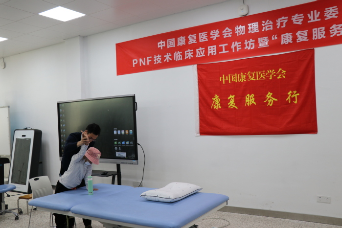 学习班分为工作坊讲座培训和社区义诊活动两部分。王翔主任从PNF技术的特点、起源告诉我们什么是PNF技术,并讲解示范了神经损失早期体位转移训练。马明主任从前馈机制、动态神经肌肉稳定技术和功能性关节共轴等知识点介绍了神经损伤核心稳定的训练。龚晨老师通过上肢功能障碍的PNF技术的实操演习与训练,介绍了神经损失上肢功能障碍的评估与治疗。郭川老师通过异常步态的PNF技术的实操训练做了神经损失异常步态的评估与处理的精彩讲座。最后,各位专家对1名脑出血后肢体偏瘫患者进行了现场病例分析,针对主要功能障碍问题运用PNF理论和技术进行了详细分析和处理。讲座结束后,社区义诊活动在新都社区卫生服务中心开展,各位专家针对现场患者的骨关节问题、神经系统问题、慢性病等进行了系统的康复指导及康复治疗。