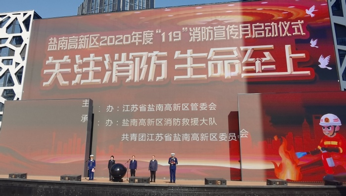 11月9日上午,由盐城市盐南高新区管委会主办、盐城市盐南高新区消防救援大队与共青团江苏省盐南高新区委员会共同承办,以“关注消防,生命至上”为主题的“盐南高新区2020年度‘119’消防宣传月启动仪式”在新弄里广场隆重举行。盐南高新区管委会副主任周志成致辞,共青团江苏省盐南高新区委员会、高新区消防救援支队等相关领导出席仪式,我校保卫处老师、50名学生志愿参加了此次活动。