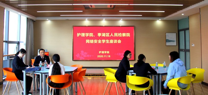 为了提高学生的安全防范意识,减少网络诈骗事件的发生,11月18日下午,护理学院联合盐城市亭湖区人民检察院开展学生网络安全座谈会,邀请亭湖区人民检察院王蓉辉主任一行来我校座谈交流,护理学院全体专职辅导员、部分有过网络受骗经历的学生以及各班学生代表参加会议。