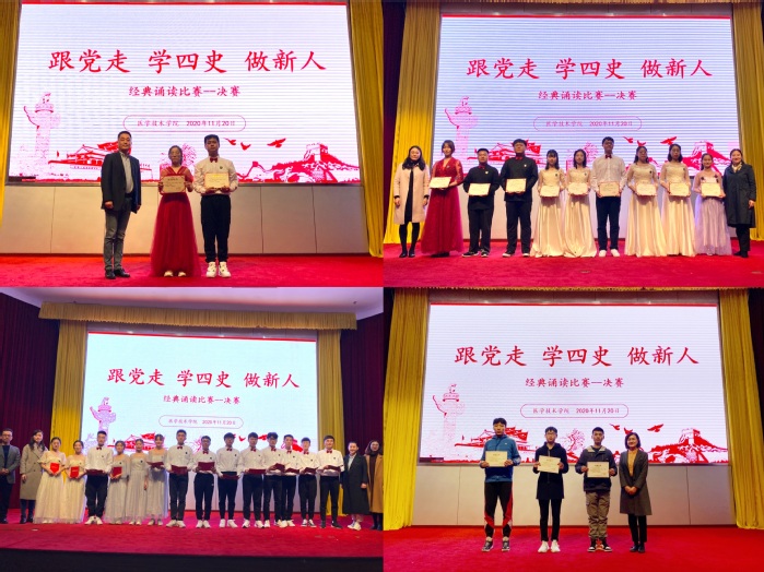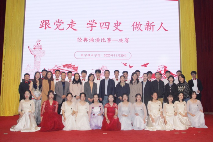 讲座结束后,医学技术学院党总支举行“跟党走、学四史、做新人”经典诵读比赛决赛。同学们认真选题,精心排练,经过初赛选拔,共有8组选手进入决赛。各代表队的青年学子诵读经典作品,歌颂伟大祖国,用深情的语言表达爱国之心、报国之志,让现场观众在抑扬顿挫的诵读中品味中华经典,感受时代脉搏。最后,赵教授进行了精彩点评,对同学们精心准备和现场表现给予高度肯定。他认为这不仅是一场经典诵读比赛,更是一场荡涤心灵的党性锤炼课。此次比赛教育引导同学们传承红色基因、争做时代新人,努力为实现中华民族伟大复兴的中国梦贡献青春力量。