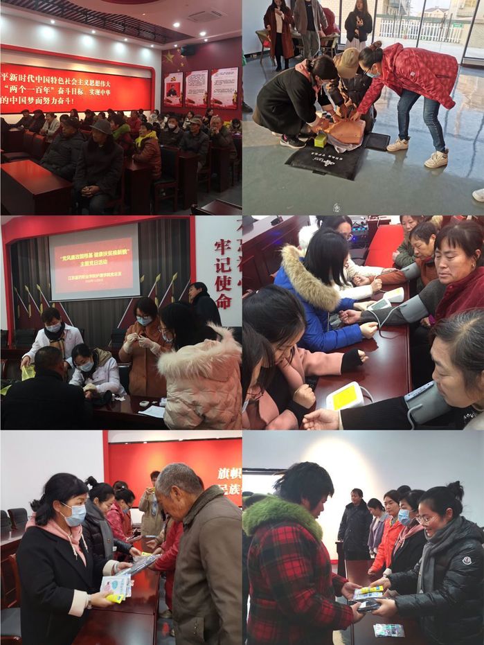 下午,全体党员教师又驱车来到我校结对帮扶地--射阳县新坍镇新潮村,集体参观了建成不久的新坍镇新潮红色文化传承馆。通过参观潮涌新坍、劳动模范、红色传承、红色历程、旧貌换新颜、走向复兴等六个主题展厅,大家感受到以全国劳动模范巴一恺为代表的一代代新坍人,为民族独立、家乡发展,洒血守家园,奋斗传旗帜,全面奔小康的发展奇迹。参观结束后,一行人来到村讲习所,学生入党积极分子代表为新潮村困难帮扶群众表演了歌伴舞“茉莉花”、小合唱“我们走在大路上”等精彩节目,秦阳老师给大家播放讲解了新冠疫情防控、慢病预防、冬季常见病预防保健等契合群众需求的专业知识视频。随后,党员教师利用专业特长,为困难帮扶对象村民量血压、测血糖、耐心回答村民有关身体健康方面的咨询。最后,学院领导为困难帮扶群众赠送抗疫防寒物资并送上美好的祝福。