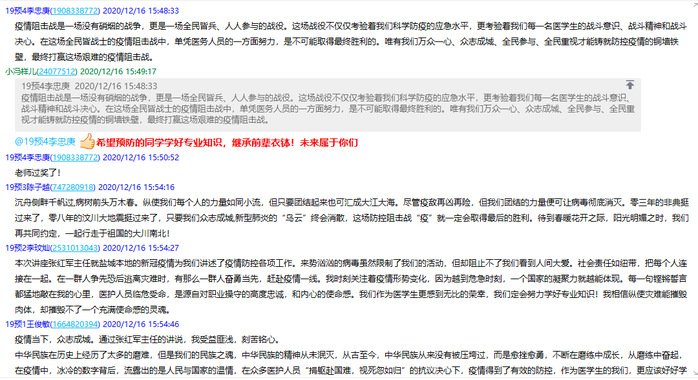 此次活动在全体党员和学生中引起了强烈的反响,与会的师生收获颇丰。党员们纷纷表示要以抗疫先进为标杆,不忘入党初心、牢记育人使命,坚守岗位,奋发有为。2019级入党积极分子们在QQ群展开了热烈讨论,并用纸笔书写感悟,他们满怀对抗疫榜样的敬佩和感动,立志要在奉献担当中谱写青春华章,在时代洪流中传递榜样力量,为祖国的健康卫生事业奋斗终身!(医学技术学院冯阳供稿、曾伟摄影,姚慧核稿)