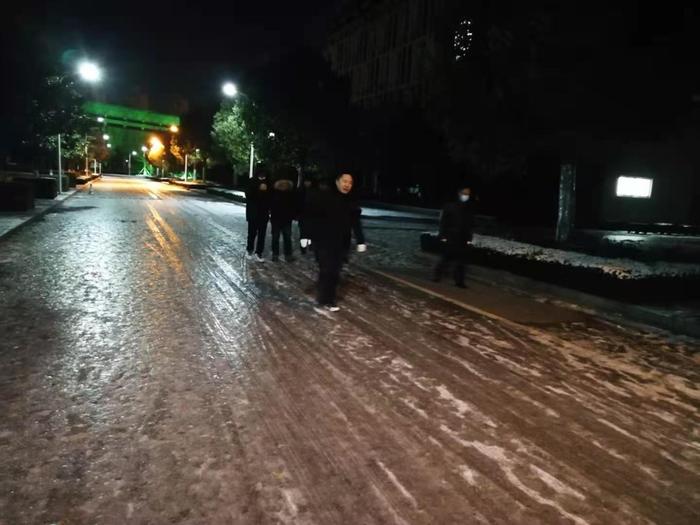 12月29日晚,物业人员安排人员值班,在各个区域撒工业盐融化地面的积雪,为师生晚间在校园内安全行走提供保障。
