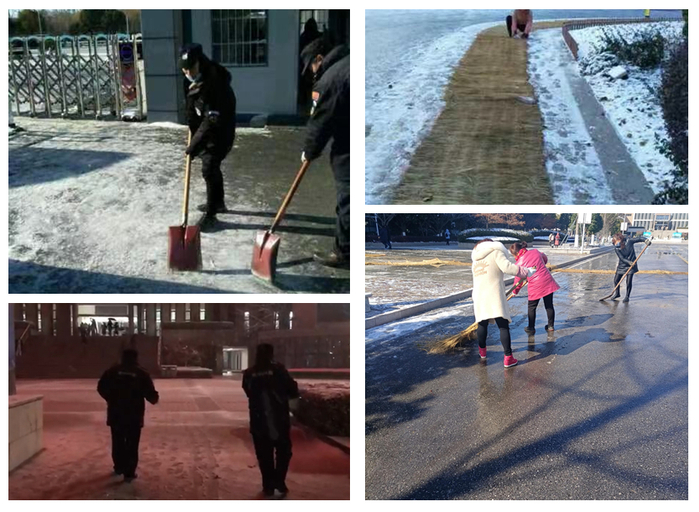 12月30日凌晨5点30分,副院长侍杏华带领后勤处部分工作人员对校园内的积雪情况进行了全面排查,安排人员对部分较滑区域铺设草席,并对进出口要道进行积冰铲除,保障了校园师生1天的学习生活井然有序。中午,校园内地面道路积冰开始融化,物业人员清理各主要干道。