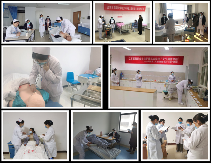 本次考核共设6站,分别为:案例分析,健康评估、基础护理操作技能、生命体征评估、急救护理操作技能、健康宣教。“案例分析”站点在OSCE中心机房进行,主要考核学生的临床思维能力;“健康评估、生命体征评估、基础护理操作”站点运用了标准化病人,在考核学生护理评估、基础护理操作技能和急救护理操作技能的同时,还对其护患沟通能力、评判性思维等能力进行测评。因此,本次护理技能考核评分标准参考了瑞金医院临床护理流程,还运用专业量表对学生的执业核心能力进行测评。各校外教学医院都高度重视此次考核,许多医院的志愿者和标准化病人均由护士长担任,东台市人民医院还在1月15日进行了模拟考核。