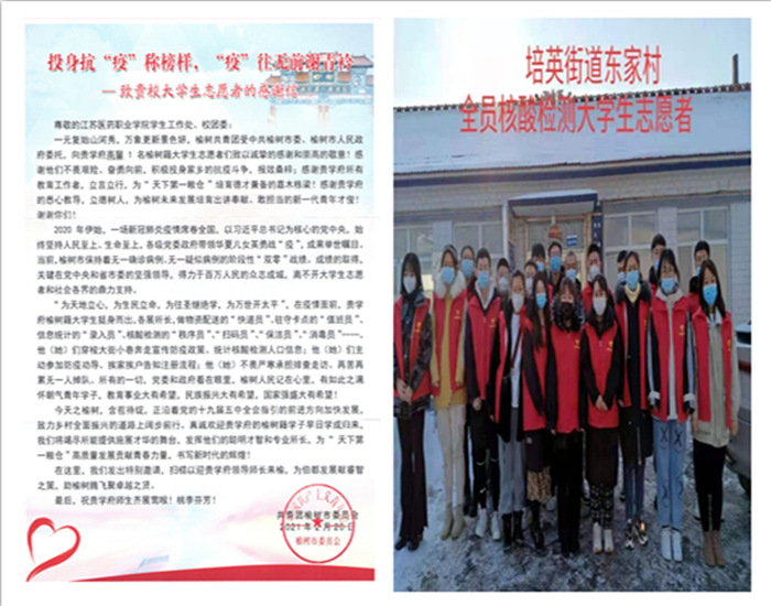 “疫情当前、青年当先,国之所向、青年所行”,这是榆树团市委专门向学校发来的感谢信。“优秀青年防疫志愿者”“镇赉县优秀青年防疫志愿者”以及“江苏省大学生抗疫先进个人”是她们获得的荣誉称号。一封封感谢信、一个个荣誉称号的背后藏着的都是苏医学子的汗水与付出,同时也彰显了社会对我校学生的肯定,对我校“三全育人”成果的肯定,更是对我校素质教育及专业培养的肯定!