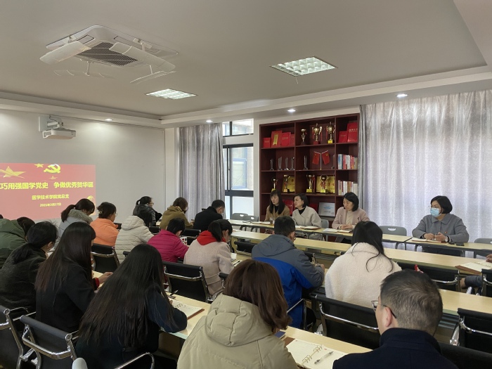为深入贯彻习近平总书记在党史学习教育动员大会上的重要讲话精神,增强党员对党史知识的学习,让党员教师们更有效地运用好“学习强国”平台,3月17日下午,医学技术学院党总支在A307会议室召开“巧用强国学党史,争做优秀贺华诞”强国学习交流分享会,总支全体党员参加会议。会议由医学技术学院党总支书记殷卫红主持。