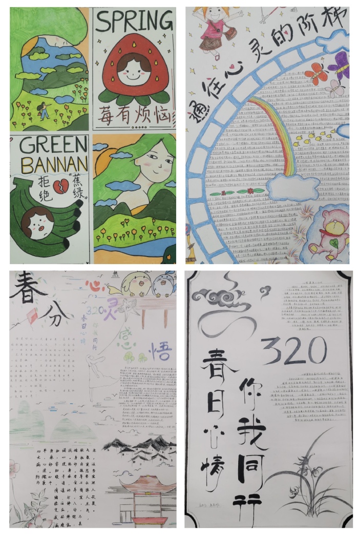 本次活动期间,共收到作品30余份。每位同学都发挥自己的才智,绘出了充满创意、积极向上的作品。2019司法鉴定技术班孙博涵同学利用谐音梗,创作出“‘莓’有没烦恼、拒绝‘蕉绿’”主题海报,新颖风趣地表达出创作主题;2020级医学检验技术1班的周钰、孙欣伟同学,将心理健康日和春分结合在一起,创作出温暖、清新的手抄报;2019级医学美容技术班张凯文的作品则主题鲜明,布局简洁。丰富多样的作品充分展现了医技青年学子积极向上的精神风貌。