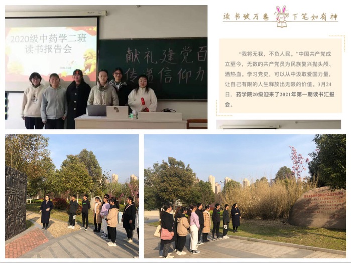 以红色文化构筑精神高地。药学院党总支把学习教育活动与育人紧密结合起来,多形式、多途径提升党史学习教育实效。开展“学习百年党史,弘扬无我精神”党史专题读书汇报会,带领同学们共读红色经典,重温历史记忆,了解党的百年征程;以周三政治学习为契机,依托“青年大学习”平台开展“学党史、强信念、跟党走”思想政治教育活动,在校班专兼职辅导员集体备课,紧紧抓住学生的关注点、兴奋点,认真组织开展线上学习,全院同上党史教育专题课,力求学习教育入脑入心入情。