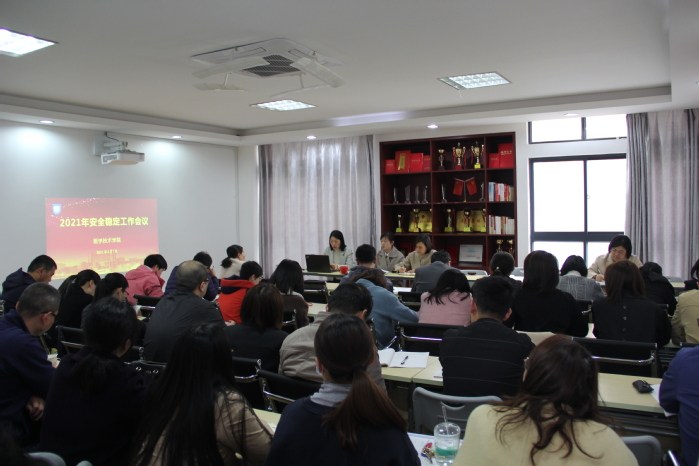 会上,俞院长总结分析了2020年度学院在安全稳定工作中存在的问题和不足,详细讲解了2021年学校安全稳定工作部署,并就综合治理工作目标、安全生产工作目标、消防安全工作目标、疫情防控工作目标、网络安全工作目标等进行了详细解读。她希望学院全体教职工进一步强化红线意识,优化育人环境,确保学校财产和广大师生员工生命、财产安全,为学校转型升级发展提供安全保障。总支书记殷卫红就做好安全稳定工作强调了三点要求:一是提高认识,切实增强安全稳定的意识。二是压实责任,全面落实安全稳定工作举措。三是围绕重点,科学抓好安全稳定工作。学院全体教职工要着重做好学生安全、办公室安全、实验室安全及疫情防控安全等各项工作,加强协同联动,及时排除安全隐患、发现问题立即整改,确保学院的安全稳定。