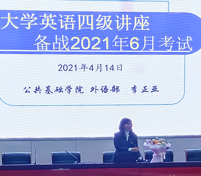 本次讲座由公共基础学院外语部主任李正亚教授主讲。李教授首先分析了以往我校大学英语四级考试情况,接着介绍了四级考试的流程、题型题量、分数设置以及考试大纲。随后,她结合案例分项讲解了写作、听力、阅读、翻译四大题型的特点、测试重点、答题要求、以往考生存在问题以及解题和训练技巧,并传授了很多实用的四级词汇记忆和练习方法。