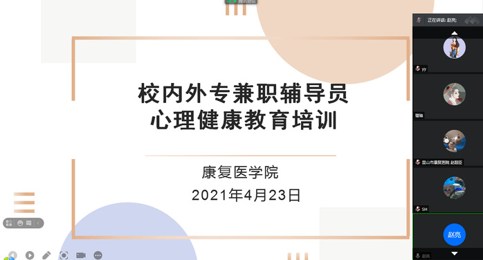 为进一步做好学生心理健康教育工作、加强校外学生的管理,4月23日,康复医学院邀请校心理健康中心主任范芃老师开展线上心理健康教育技能培训会议。培训由康复医学院党总支书记赵亮主持,学院全体校内外专兼职辅导员参加培训。