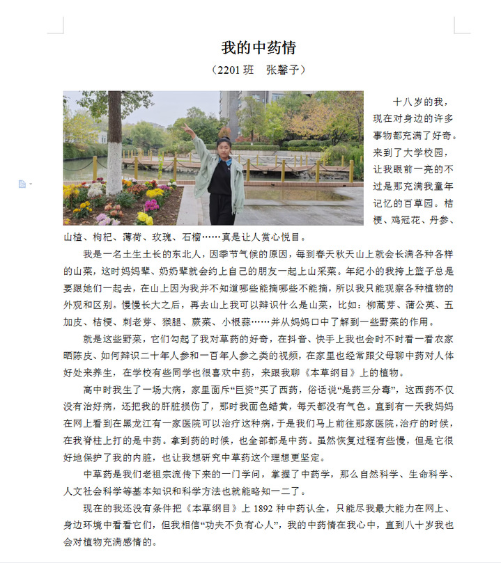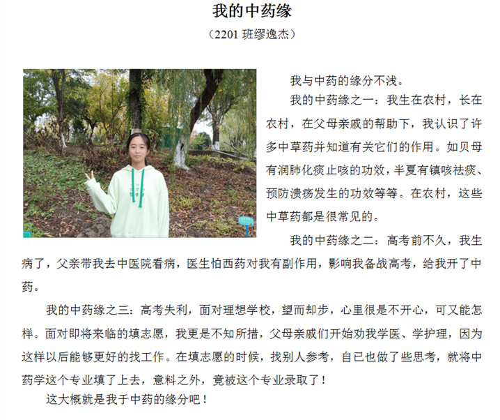 为了激发学生学习中药的热情和动力,自开学伊始,药学院中药教研室在2022级中药学专业学生中开展了“我的中药缘(情)”征文活动,倡导同学们谈谈与中药、中药学专业的缘分,畅所欲言,真情实感,不限体裁、形式和字数,以实现自我总结或共同分享之目的。
