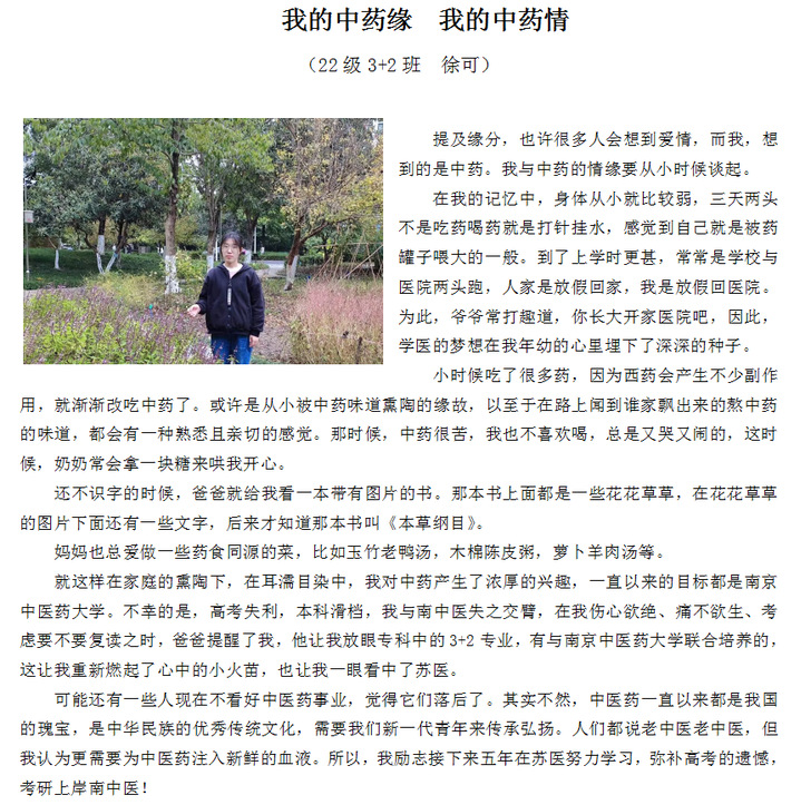 征文活动得到了同学们的积极响应。有的同学回顾自己与中药的漫长情感,选择中药仿佛命中注定;有的同学只因高考失利懵懵懂懂填报专业,遇上中药实乃人生缘分;有的同学则依父母所命踏入苏医,从事中药担负传承使命。同学们的字里行间既流露出与中药的特殊情缘,又表达了学好中药、从事中药、坚守中药的决心意志。通过同学间、班级间、师生间的共享交流,形成一股彼此鼓励、相互支持、共同促进的良好氛围。