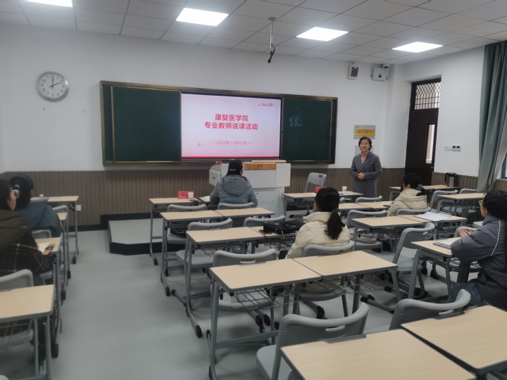 为提升教师教育教学水平,促进教学方法和教学手段的改革创新,全面提高课堂教学质量,11月30日下午,康复医学院在智慧教室K105举办教师说课活动。本次活动特邀校内专家周滋霞教授指导,由陆建霞院长、周滋霞教授担任评委,对四位参与说课的老师进行打分及点评,全体在校专业课教师参加活动。