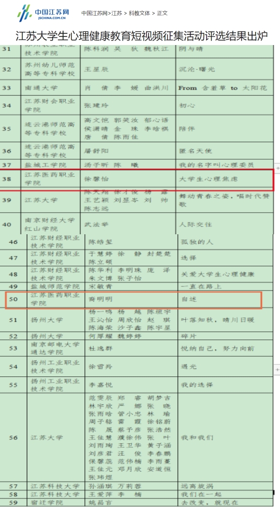 近日,江苏省教育厅“青春新形象 健康‘心’征程 大学生心理健康教育短视频征集活动”评选结果公布。本次征集活动由江苏省教育厅教育宣传中心(江苏教育报刊总社)主办,《江苏教育报》编辑部承办,中国江苏网、《扬子晚报》协办,旨在进一步加强大学生心理健康教育工作,展示全省各校大学生心理健康教育工作优秀成果,树立大学生自尊自信、理性平和、积极向上的良好形象。各高校积极响应,组织师生踊跃参加,共报送心理健康教育短视频数百个。经三轮评选,我校医学院临床医学2205班钦雨荟,杨可,王淑,徐馨怡,何心怡,仲烨作品《大学生心理焦虑》、医学技术学院预防医学2202班裔明明、连玉晨作品《自述》分别荣获二等奖、三等奖。