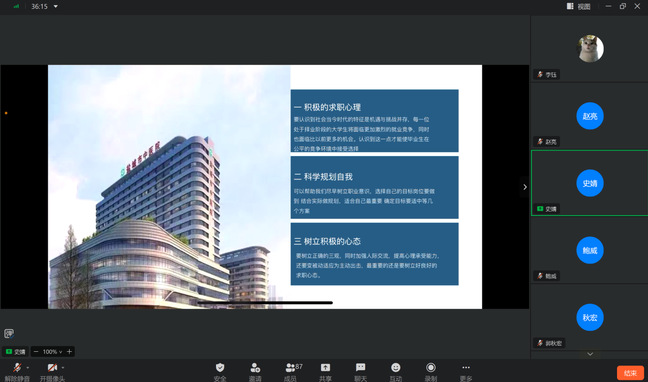 分享会上,分别就职于公立医院、私立医院、社区医院、康复机构的5名优秀毕业生详细区分了不同工作环境的优劣,生动讲述了自身在求职时遇到的各种事迹和应对策略,大方分享了求职时填写简历、网申、备考、笔试、面试等技巧,热情提供了就择业建议和就业指导。同学们在线上踊跃提问,毕业生们耐心作答,思想的火花碰撞交织,评论区热火朝天。