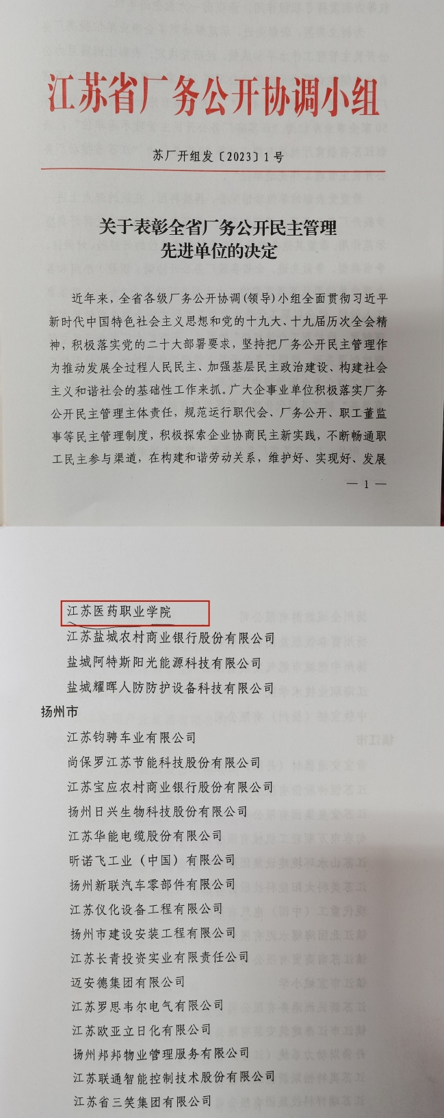 近日,江苏省厂务公开协调小组下发《关于表彰全省厂务公开民主管理先进单位的决定》(苏厂开组发〔2023〕1号),表彰了一批在厂务公开民主管理中发挥了积极作用的先进单位。我校被授予“江苏省厂务公开民主管理先进单位”荣誉称号,这是对学校多年来校务公开民主管理工作水平和成效的充分肯定。