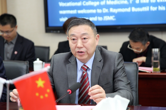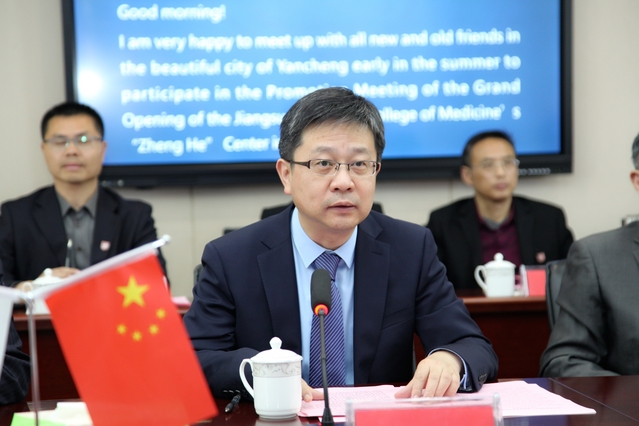 盐城市人民政府蒋巍副市长在讲话中,对布苏蒂尔博士的来访表示热烈欢迎,他充分肯定了江苏医药职业学院在开展高水平国际化职业教育模式探索,服务“一带一路”发展方面所做出的努力和成绩,他希望学校能够坚持以世界眼光、国际标准和中国特色建设郑和中心,努力将中心建设成为江苏海外人才培训、师生访问交流的重要基地,成为展示江苏教育形象、开展对外交流的重要窗口,为全世界共同绘就美美与共的人类命运共同体新画卷增添一抹靓丽的苏医红。