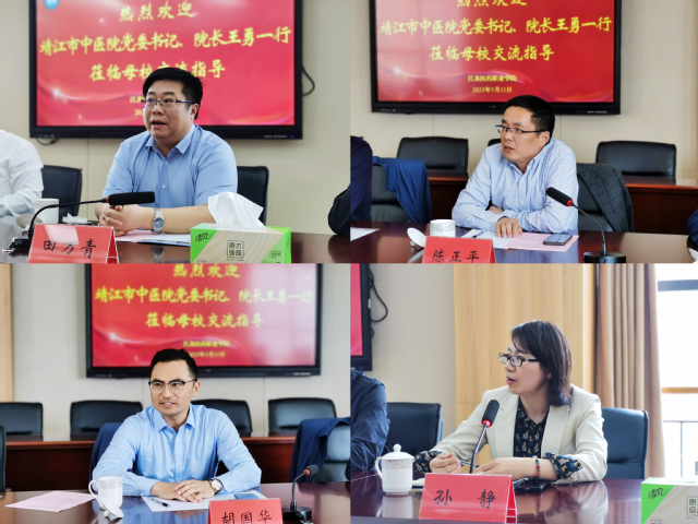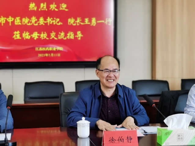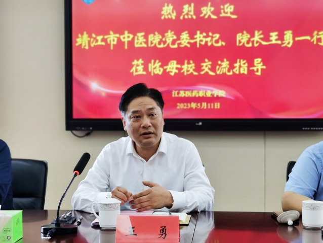 靖江市中医院党委书记、院长王勇对母校的热情接待表示感谢,对近年来母校发展所取得的成绩给予高度肯定,他详细介绍了医院的整体规划、教学科研、人才引培等方面的情况,同时也表达了希望与学校加强教学合作、共促发展的意愿。