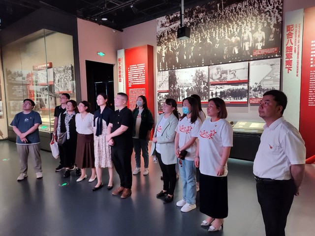 下午,双方支部同志共20余人一同参观了盐城新四军纪念馆。大家认真听取了纪念馆有关人员对建立新四军江南指挥部的经过情况及浴血奋战等有关事迹的介绍,纷纷感叹新四军取得胜利的不易,将继续继承、发扬革命先辈的优良传统,大力弘扬艰苦奋斗的优良作风,用铁军精神滋养初心,践行使命、不懈奋斗、凝聚力量,把教育工作做得更好。