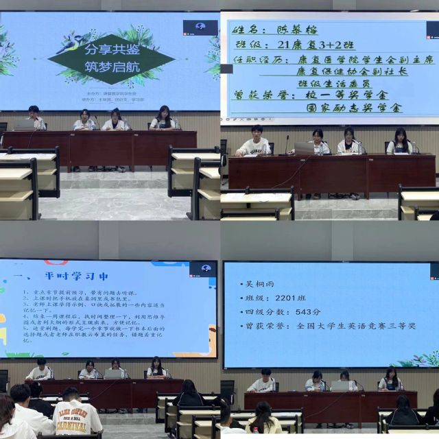 为营造良好的学习氛围,帮助康复医学院学生掌握更科学的学习方法,制定更合理的人生规划与学习计划,5月31日晚,康复医学院开展同辈成长分享会。此次活动线上线下同步进行,邀请了在专业课程、英语四级与专转本考试中取得优异成绩的五位同学担任主讲者,康复医学院200余名同学参加了此次活动。