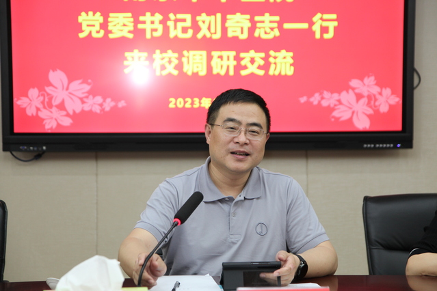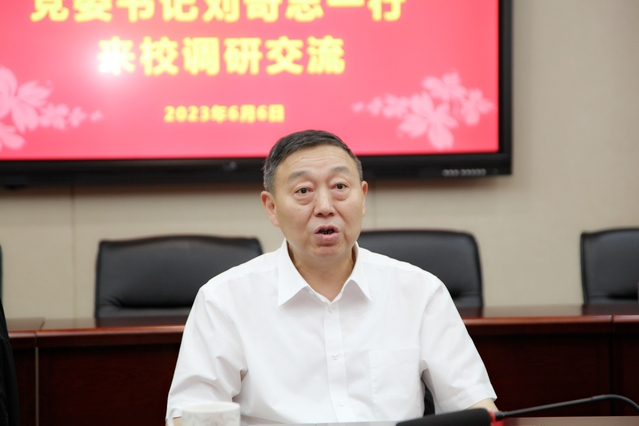 交流会上,郝书记代表学校对刘奇志书记一行的来访表示热烈欢迎,并简要介绍了盐城的地理风貌和城市特点以及学校近年来的发展成绩,他希望双方能以本次交流为契机,加强彼此沟通联系,促进校院深度合作,为社会培养更多高质量医药卫生人才。陈国忠院长从学校历史沿革、专业建设、人才培养、师资队伍、科技服务等方面介绍了学校近年来的发展情况,并希望双方能够在科技服务、师资培训、学生临床实习等方面共同探索合作路径,实现互利共赢。